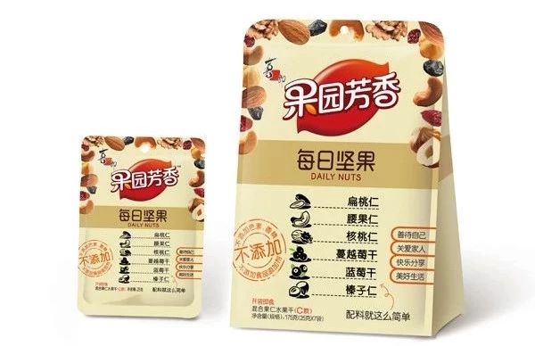 而在包装形式上,“果园芳香”每日坚果有袋装和盒装两种规格,内部产品遵循市场惯例,采用小袋包装,携带方便,食用方便,满足消费者各种场合食用。