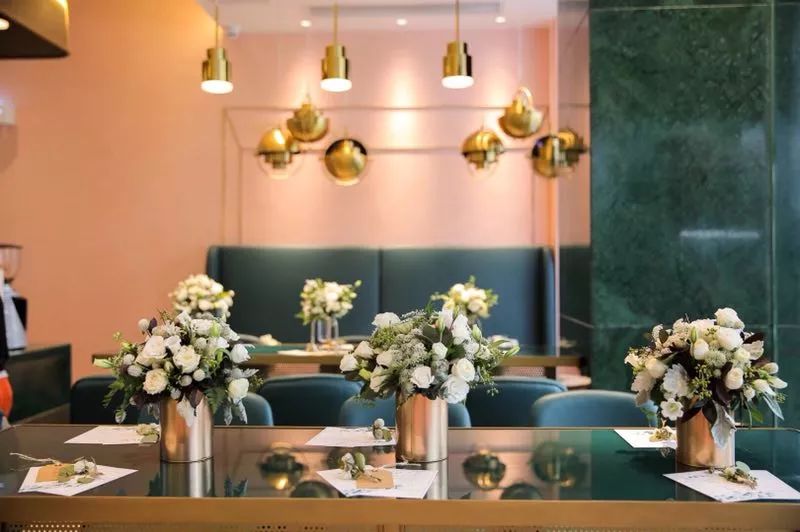在视觉上,相比于奈雪の茶的明快,梨山选择了以墨绿、杏粉、金色为主色调,相比之下显得深远厚重。