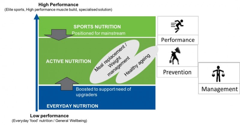 如图1所示,按照产品的性能表现,或者说对营养需求的专业程度,从低到高依次为日常营养(Everyday nutrition)、活力型营养(active nutrition)、专业运动营养(sports nutrition)。专业的运动营养食品普遍具有高性能,是行业引领者;活力型营养品多针对爱好运动健身的普通人群,产品诉求集中于代餐、体重管理和健康老龄化;低性能的营养食品则定位于满足每日基础营养需求,保证身体健康。