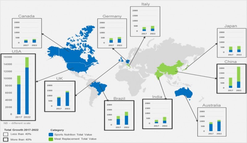 ▲ 图3、2017和2022年,全球Top 10蛋白类产品消费市场对于不同功能产品的消费额预测| Source: Euromonitor