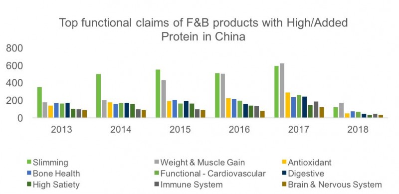 ▲ 图4、2013-2018年,中国蛋白类产品中不同功能宣称的统计分析。Source: Mintel GNPD