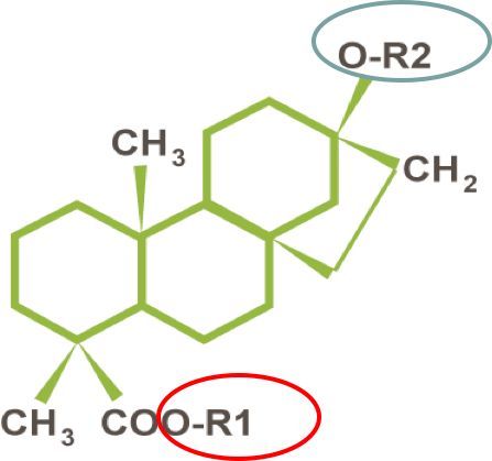 甜叶菊的甜味成分被称为甜菊糖苷,它们的有一个共同的甜菊醇骨架(二萜*-有机化合物w/ 4异戊二烯,它们是其他生物活性化合物的基础,如视黄醇),而葡萄糖单元的数量及其在甜菊醇骨架上的排列各不相同,使得每种甜菊糖苷都具有独特的口感和甜味。其中,Stevioside和Reb A最为常见,二者合计含量占甜菊叶总成分的14-18%。