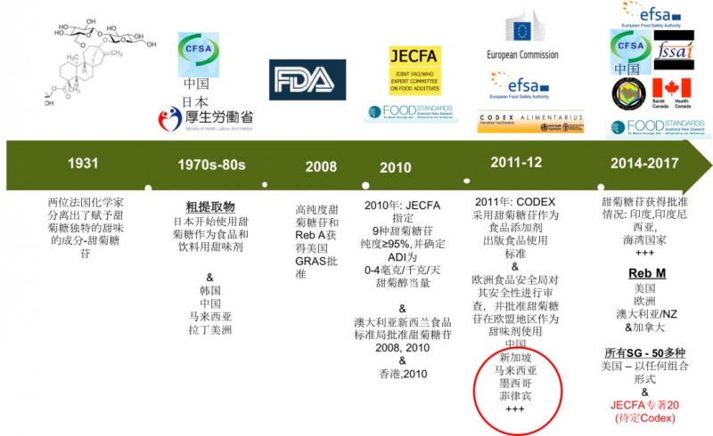 自1931年两位法国科学家分离得出了富裕甜菊糖独特甜味的成分-甜菊糖苷之后,其在全球各个国家也逐步获得主要法规监管机构的批准,现已在全球100多个国家获准使用。