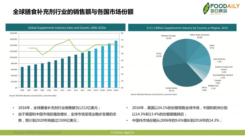 考虑到中国市场上除了本土企业生产的营养素补充剂外,还有大量进口的以普通食品身份来管理的海外产品,因此,为了从全球产业层面来理解中国市场,我们在下面的表述中仍然使用“膳食补充剂”一词。