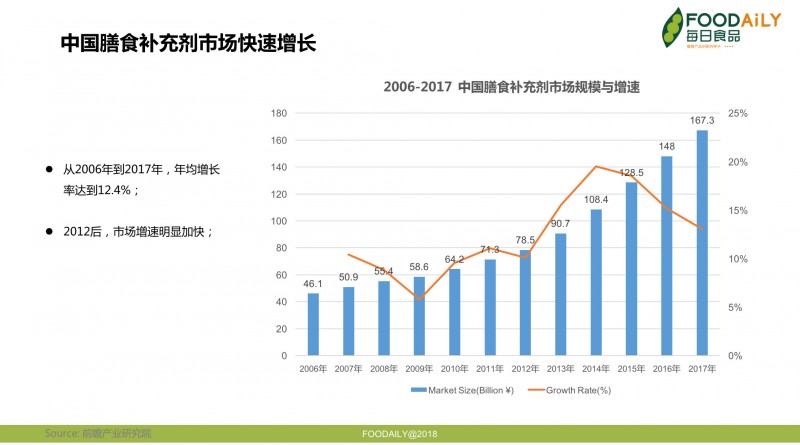 ▲ 图 2006-2017年中国膳食补充剂市场规模和增速 | 来源:前瞻产业研究院