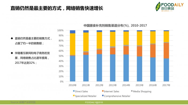 中国的膳食补充剂销售分为非店铺和店铺销售2大类。店铺销售包括各类专卖店和综合性零售商;而直销、网购和广播电视购物等组成了非店铺销售。从下图可见,直销仍然是最主要的销售方式,占据了约一半的销售额。网络销售跟随着中国互联网和电子商务的高速发展而逐步抢占了店铺销售的份额,2017年,网络销售占比达到32%。可以预见在不远的将来,网络将会成为占比最大的销售渠道之一。