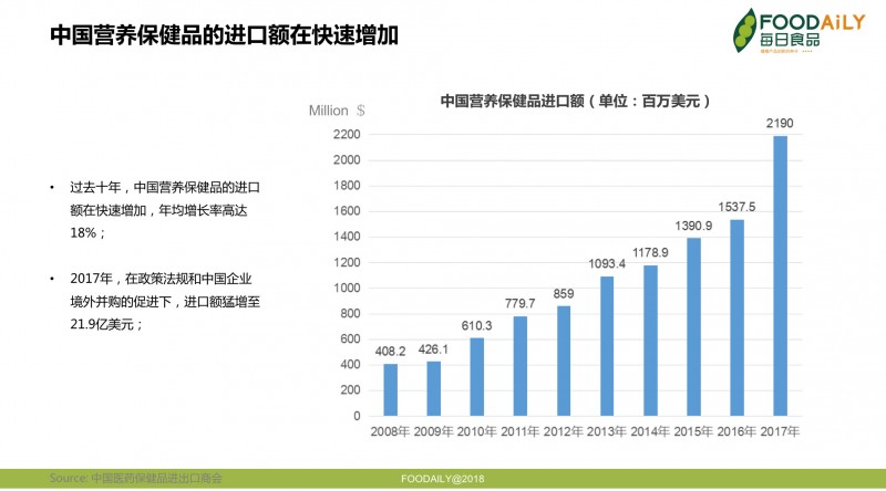 从2008年到2016年,中国进口的营养保健品以年均18%的高速增长。2017年,得益于新《保健食品注册与备案管理办法》和跨境电商政策,以及中资企业的跨境并购,营养保健品进口额较2016年大幅提升,猛增到21.9亿美元。