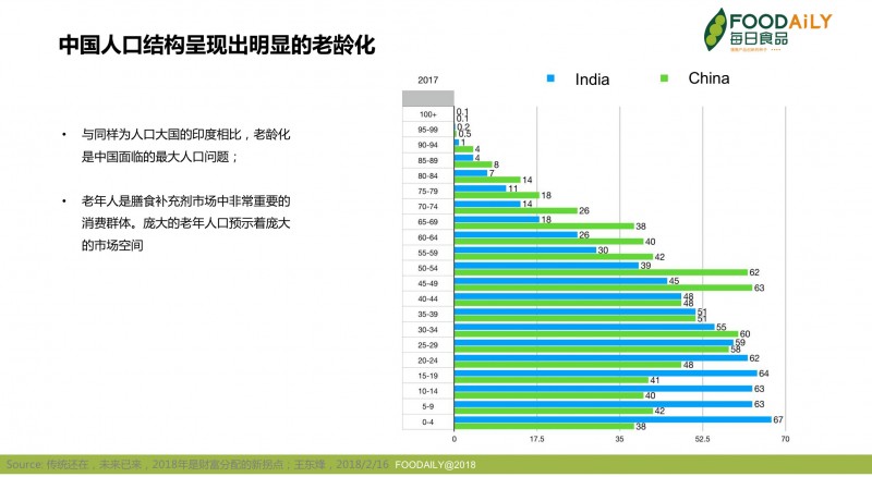 ▲ 图 2017年中国与印度人口结构对比 | 来源:传统还在,未来已来 2018年是财富分配的新拐点;王东烽,2018/2/16