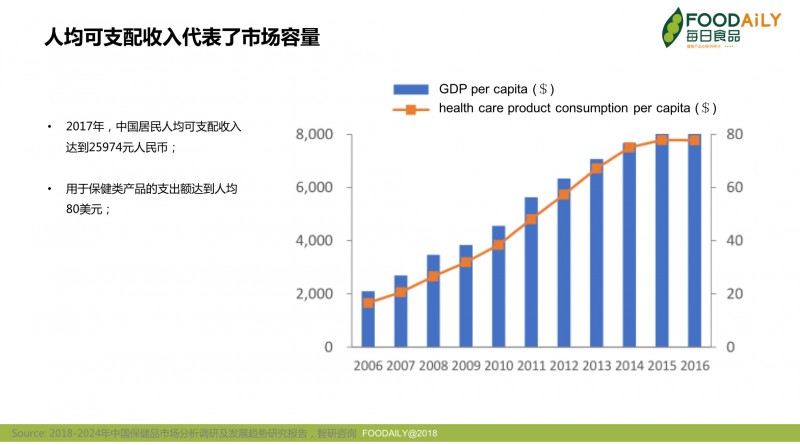 ▲ 图 2006-2017年,中国人居GPD与可支配收入(单位:美元)| 来源:2018-2024年中国保健品市场分析调研及发展趋势研究报告,智研咨询