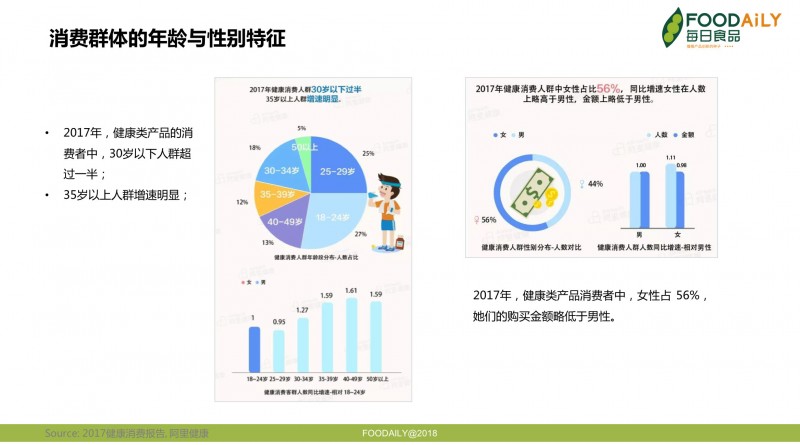 年龄上,30岁以下人群成为健康类产品消费的主力军,35岁以上人群增速明显。从性别上看,女性占了56%,表明女性具有更强的健康意识,但人均消费额略低于男性。