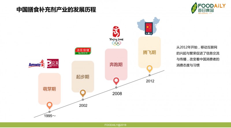 第四个阶段是起始于2012年的腾飞期。这一年中国有几件事的发生与膳食补充剂密切相关,正如前面在分析中国市场增速变化的原因时所提到,移动互联网在中国大发展,信息化的飞跃改变了人们的消费习惯和消费观念,中国膳食补充剂行业开始整体加速上升。