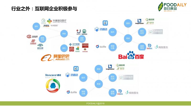 这样一个充满活力和商业潜力的行业,吸引了很多人,很多力量的参与。来自互联网的推动力量尤其重要,以阿里、腾讯和百度三大互联网公司为代表,纷纷将包括医药和运动健身在内的大健康产业纳入业务版图。他们通过专业网站、移动终端和可穿戴设备,将医生、医疗资源、消费者和消费数据等联通,加快数据和资源的流通速度与使用效率,从而提升整个健康产业的服务水平和经营水平。
