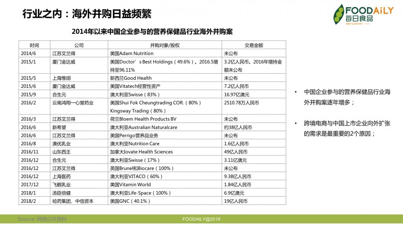 另一方面,跨境并购满足了中国上市公司外延扩张的需求。由于中国保健食品市场尚有较大增长潜力,同时行业盈利性显著,催生了跨境并购的热潮。