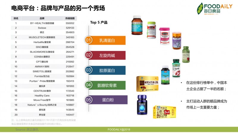 在外部和内部多股力量的作用下,中国膳食补充剂行业呈现出分化与竞争的大格局。从一份源于电商平台销售数据的榜单中我们看到:汤臣倍健、修正、康恩贝、姿美堂、活力达等中国本土品牌占据了榜单一半的位置,海外品牌多为澳洲和北美品牌。值得注意的是,Muscletech、康比特和汤臣倍健旗下的健乐多这三个品牌都是主打运动营养人群,运动人群正在成为膳食补充剂市场上的一支重要力量。