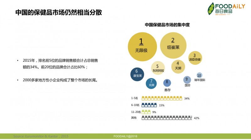 ▲ 图 2015年中国保健品市场集中度 | 来源:Euromonitor & Kantar