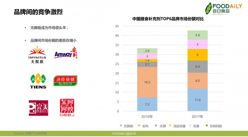 2017年,市场份额位居前6位的品牌分别是无限极、安利、纽崔莱、天狮、汤臣倍健、完美和东阿阿胶。对比2010年的数字,除了安利的份额下降外,其余品牌都在上升,品牌间的差距在缩小。