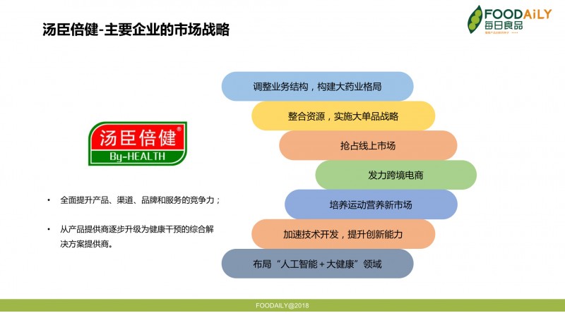 先来看成立于1995年的汤臣倍健。近几年来,它的业绩一直在非直销领域中位居首位,2017年汤臣倍健开始实行更为务实的市场战略。包括:构建大药业格局;施大单品战略;抢占线上市场;发力跨境电商;培养运动营养新市场;加速技术开发,提升创新能力;布局“人工智能+大健康”领域等。