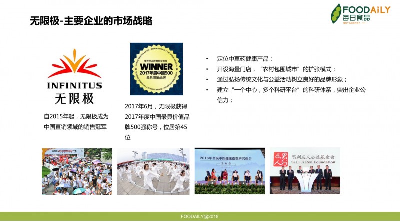 第二家是无限极。成立于1992年的无限极是中国本土最早的膳食补充剂公司。它跟安利、完美、天狮一样,都是走直销模式。到2015年,无限极超过安利跃升为直销领域的销售冠军。去年6月,无限极获得2017年度中国最具价值品牌500强第45位。