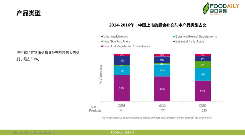 ▲ 图 2014-2016年,中国上市的膳食补充剂中产品类型占比 | 来源:Innova Market Insights