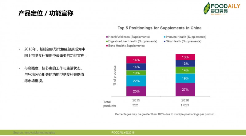 2016年,中国上市的膳食补充剂中,功能宣称的前5位分别是基础健康、免疫健康、消化与肝脏健康、皮肤健康和骨骼健康。具有基础健康宣称的产品占比较2015年提高了7个百分点,这反映出中国消费者健康观念的转变,即从治疗和预防,转为日常的保养。