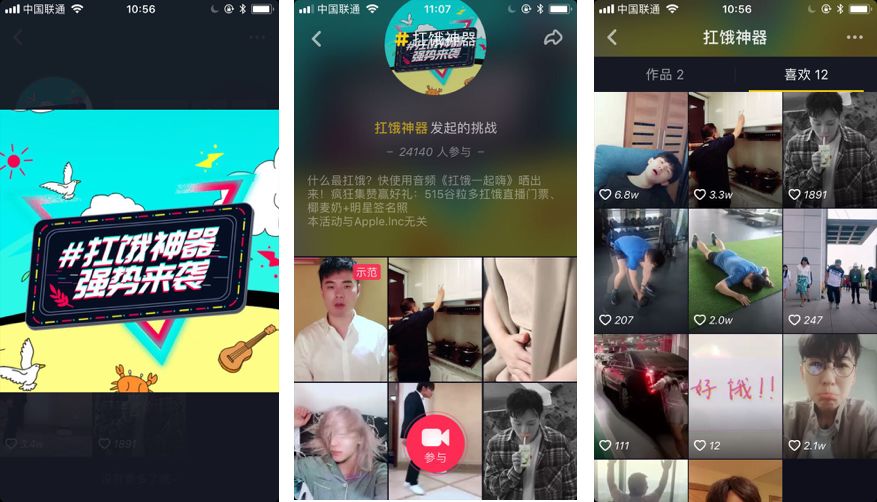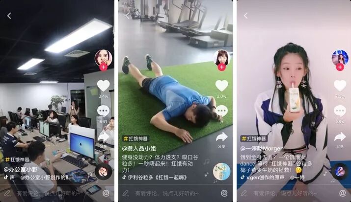 抖音上开展的“扛饿神器”魔性生动的音乐和众多明星达人在不同场合的搞笑动作,配上集赞赢好礼和直播门票等大礼等,都让“扛饿神器”得以在年轻消费者中广泛传播。目前,已有数万抖音用户参与#扛饿神器#挑战活动,进一步夯实了谷粒多扛饿大品牌和扛饿神器的地位。