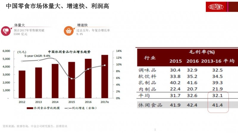 2012-2017年,中国零食市场经历了飞速的发展,在过去的这五年间,零食市场的年复合增长率达到了9.4%,预计2017年零售额会突破5500 亿元。据统计,中港两地上市的休闲食品企业在2013-2016年间,毛利率平均高出其他食品上市公司9.3 个百分点。