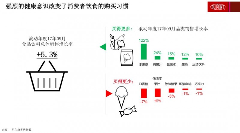 强烈的健康意识改变了消费者的饮食购买习惯。根据尼尔森零售指数,在2017年09月的滚动年度,水果茶的增长率达到了122%,其次是纯果汁(24%)、包装水(15%)、酸奶(12%)和运动饮料(10%),而代表不健康饮食习惯的类别,如口香糖、低浓度果汁、散装糖果、即溶咖啡和巧克力等,都有了不同程度的下滑。
