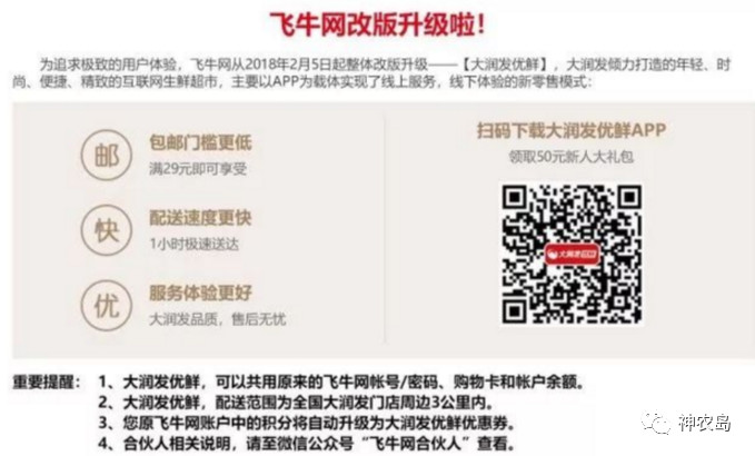 另外,我们还发现,大润发旗下电商网站飞牛网已经从 2 月 5 日起全面升级改版为 " 大润发优鲜 ",并取消了 PC 端官网,全部以 APP 形式运营,运营范围也从全国改为大润发门店三公里范围。