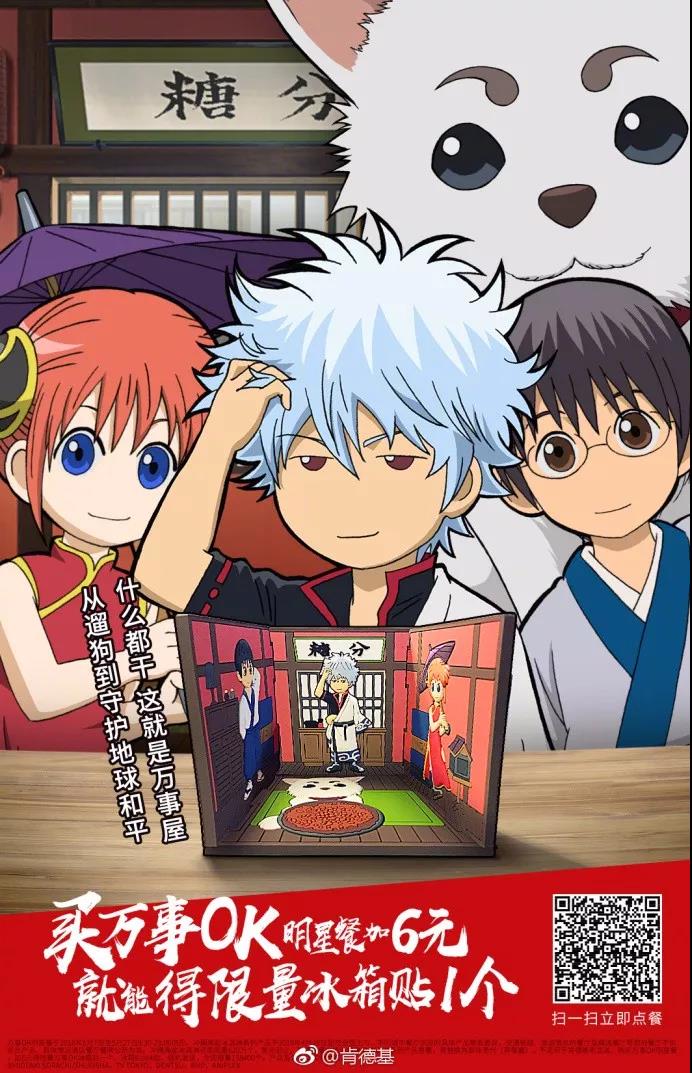 肯德基与银魂合作,主打其新推出的万事 OK 明星餐和颜色漂亮的“冲绳海盐冰淇淋花筒”,不了解银魂的消费者们接受程度如何不得而知,喜欢动漫的人却仿佛迎来了节日,因为银魂会推出肯德基遇上万事屋的神剧情,虽然无厘头,只要能重新看到银魂那张脸,就足够让人兴奋了。