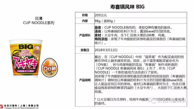 由于SNS上温泉蛋配CUP NOODLE的搭配大热,日清推出了加入了温泉蛋“ON蛋”的寿喜锅风味产品。汤底是加入了甘甜酱油、浓郁牛肉+蔬菜风味的寿喜锅经典风味。特别加入了日清独家的“大豆蛋白制牛肉”。