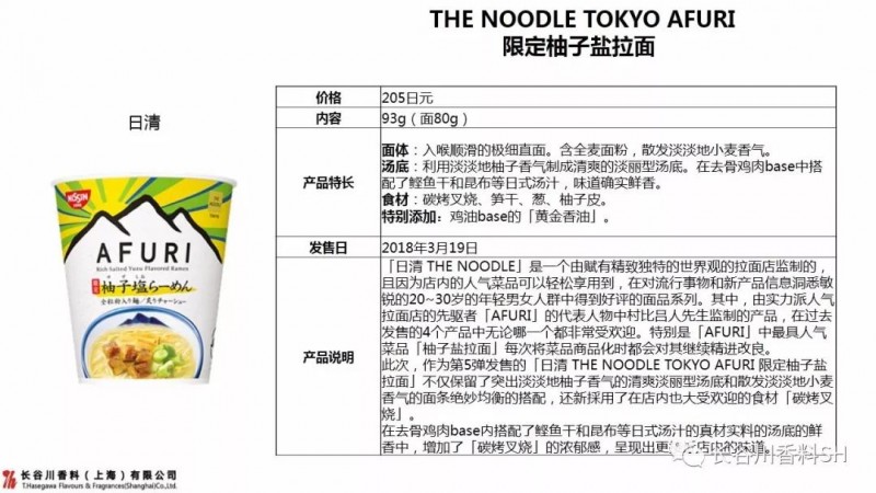 作为「THE NOODLE」系列第5弹产品「日清 THE NOODLE TOKYO AFURI 限定柚子盐拉面」不仅保留了突出淡淡地柚子香气的清爽淡丽型汤底和散发淡淡地小麦香气的面条绝妙均衡的搭配,还新加入了在店内也大受欢迎的食材「碳烤叉烧」。还原度更高。