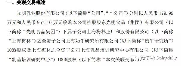 光明乳业今晚公告,收购两家关联公司上海奶牛研究所有限公司和上海乳品培训研究中心有限公司的100%股权,耗资约1137万元。被收购的两家公司属于光明乳业控股股东光明食品(集团)有限公司下属子公司上海梅林正广和股份有限公司。