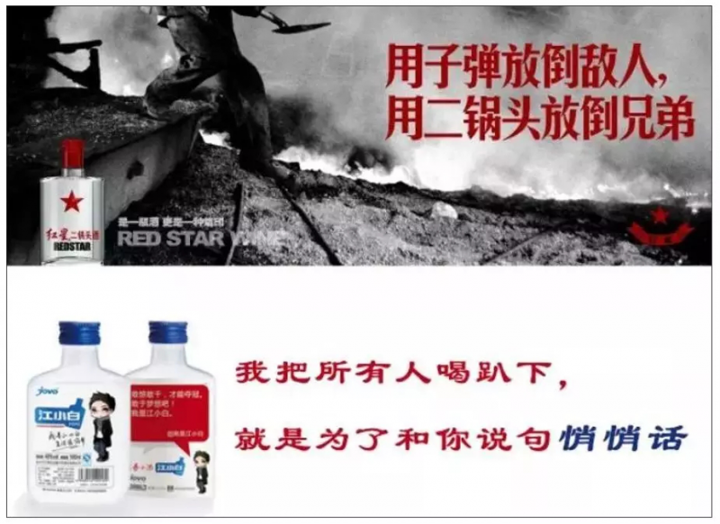 同样是喝趴下,对比下红星二锅头的“用子弹放倒敌人,用二锅头放倒兄弟”,再看一下江小白的“我把所有人喝趴下,就是为了和你说句悄悄话”。哪个有更多应景?