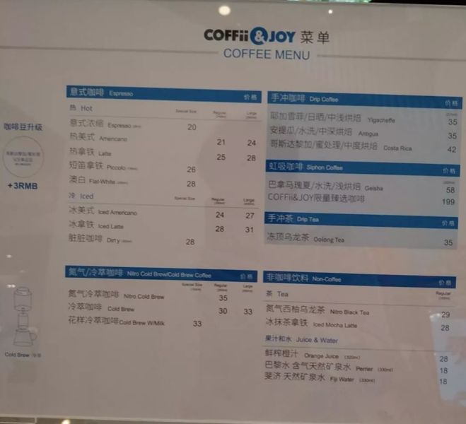 从菜单可以看到,主要产品线分意式咖啡、冷萃咖啡、手冲咖啡和茶饮、果汁等非咖啡饮料。价格分布在30元左右。值得注意的是,最贵的一款臻选咖啡产品单价199元。