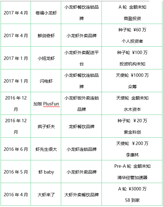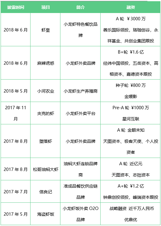 l 夹克的虾、堕落虾、麻辣诱惑、虾皇等小龙虾创业企业相继获投,大量商家涌入小龙虾餐饮市场,小龙虾连锁品牌、小龙虾外卖、小龙虾电商、小龙虾供应链等领域受资本认可;