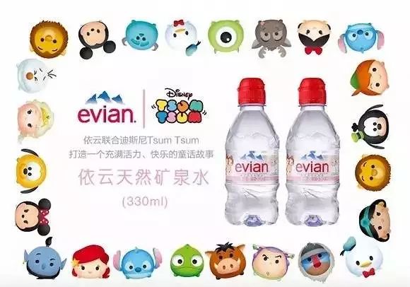 2016年,依云和迪士尼合作推出了“依云儿童瓶”;该款饮用水选取了69个经典、可爱的迪士尼Tsum Tsum卡通形象,打造成“依云儿童瓶(迪士尼限量版)”。