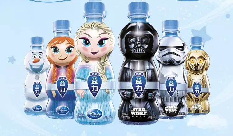 2017年6月,达能推出了一款“益力卡通趣味瓶”。达能与迪士尼达成合作,特别采用了《冰雪奇缘》中的艾莎、安娜和雪宝形象,以及《星球大战》中的黑武士、暴风战士和C-3PO形象作为包装设计的主要元素,这6款不同包装的产品,不仅展示出“高颜值”的姿态,还充满了趣味性,让孩子爱不释手。这款产品针对儿童消费群体,水质纯净、益于健康,造型小巧,330ml规格非常适宜儿童饮用。