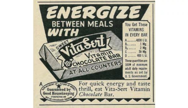 上图是一张1917年美国农业部印发的海报。政府宣传尚且要蹭一蹭维生素的“热点”,更何况那些聪明的商人们呢?甜甜圈、巧克力,各种食品不管是不是有必要,都以添加维生素作为卖点,社会刮起了一股健康之风。