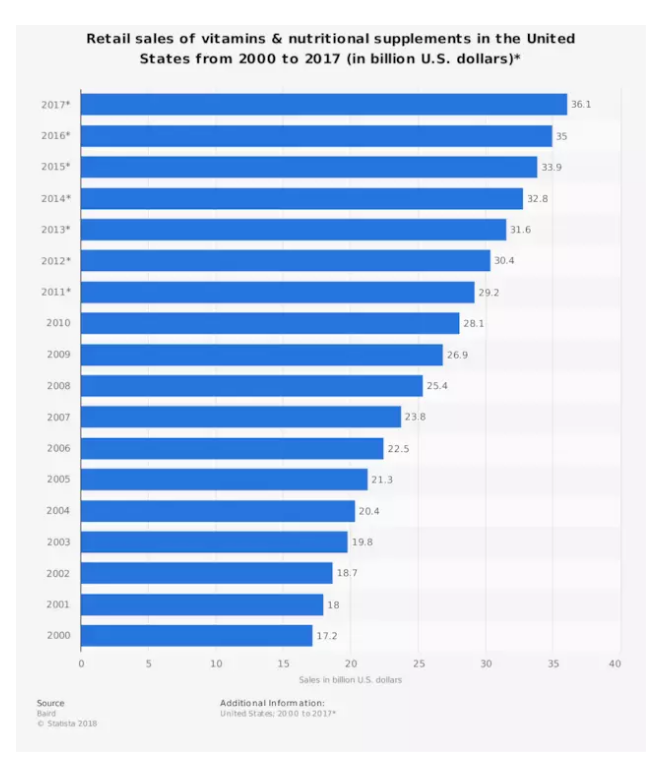 美国维生素补充剂市场连年成长,已是规模上百亿美元的生意。(图片来源:Statista)