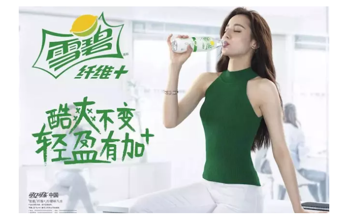 今年三月份可口可乐中国推出的雪碧纤维+——其纤维指的是“抗性糊精”,这种水溶性膳食纤维能让人产生饱腹感——还找来迪丽热巴代言,拍了好几支“迪丽热巴的轻盈小秘密”广告片,把“雪碧”和健康、减肥概念联系起来,在线上视频和线下便利店不断洗脑受众:“雪碧纤维+ 含有丰富膳食纤维”。