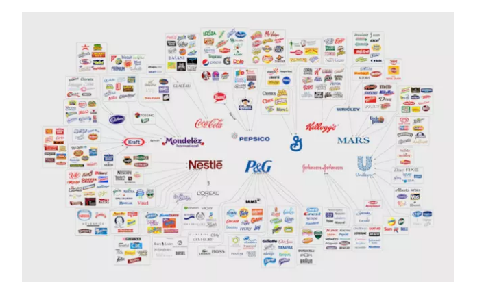 少数巨头垄断食品业。一家公司旗下覆盖几百到几千个品牌。(图片来源:journal)
