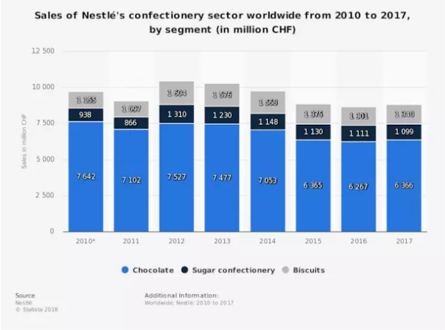 自 2012 年以来,随着消费者减少垃圾食品和含糖食品的摄入,雀巢的甜食业务整体也呈下降趋势,今年它还把旗下三个糖果品牌卖给了意大利巧克力制造商费列罗。