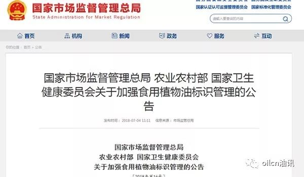 国家市场监督管理总局、农业农村部、 国家卫生健康委员会发布了《关于加强食用植物油标识管理的公告》,对调和油、转基因食用油等标签标识管理工作做出了明确规定。
