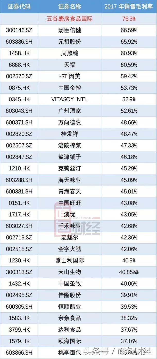 这个是一个相当高的毛利率水平。之前,我们梳理过沪港深三市的食品类(不含酒类)上市公司的毛利率,五谷磨房的毛利率在沪港深三市中居然是最高的,甚至远高于保健品。