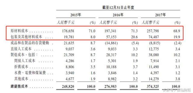 在总销售成本中,其原材料的成本占到了68.9%,是最主要的成本构成,另一个占比较大的则是包装成本,占19.9%,两项合计达到88.8%。
