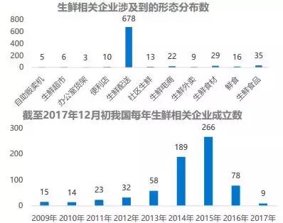 2015年成立的生鲜相关企业数最多为266家,2017年生鲜企业成立数仅9家,9年来最少,但是早几年成立的生鲜企业正谋求新发展方向,尤其是与新零售的结合。