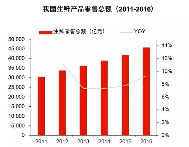 我国人口众多,生鲜作为居民日常饮食必需品,消费零售总额十分庞大。根据 Euromonitor 数据,2016 年我国生鲜产品零售总量 3.24 亿吨,零售总额 4.57 万亿元,同比 2015 年增 长 9.30%,其中蔬菜类与水果类销量占比均超过 30%。根据国家统计局数据,2016 年我国社会消费品零售总额为 33.23 亿元,按此计算生鲜零售总额在社零总额中的占比高达 13.8%。