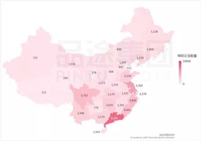 对于咖啡消费的基础,我们来看一组数据。中国整体咖啡消费区域发展不均衡,通过数据对比,我们可以看到一个很有意思的现象,中国南方的咖啡企业数量要远高于北方区域。