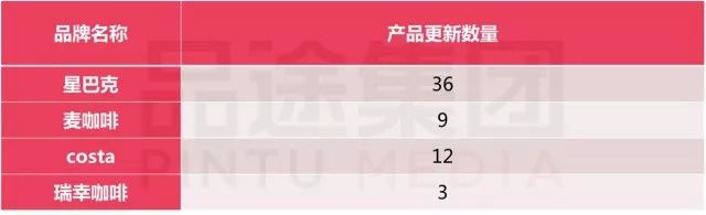 品途智库盘点了几大核心品牌,在过去半年产品更新数量,星巴克以36款新产品遥遥领先,而瑞幸咖啡仅更新了3款新产品。