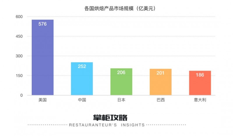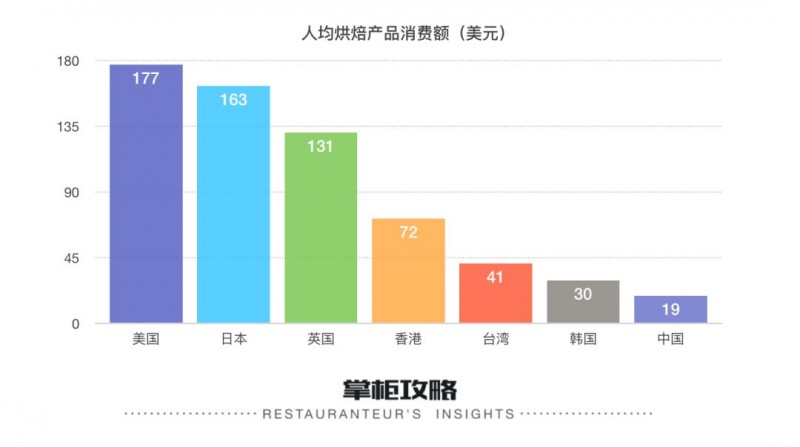 美国人对碳水化合物的需求远超其他国家,根据 2016 年 Euromonitor 研究机构对全球烘焙产品消费终端的统计,美国烘焙食品的市场规模高达 576 亿美元,远超第二名(也就是中国)的 252 亿美元;具体到个人,美国人均烘培产品年消费额为 177 美元,日本和英国紧随其后,中国人均烘培产品的年消费额仅为 19 美元,是美国人的十分之一。
